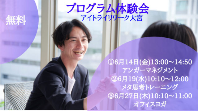 こんにちは。JR大宮駅にあるアイトライリワーク大宮(自立訓練事業所)です。2024年6月14日、19日、27日にリワークプログラム体験会を開催します。復職や再就職をお考えでしたら「リワーク」を活用してみませんか?まずは、お気軽...